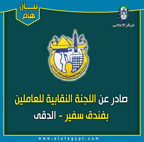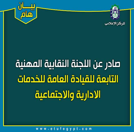 اللجنة المهنية النقابية التابعة للقيادة العامة للخدمات الإدارية والاجتماعية برئاسة هشام عبد اللطيف والأمين العام للنقابة العامة للخدمات الإدارية تستنكر كافة محاولات الهجوم من القوى السياسية المدعومة من منظمات حقوقية مشبوهة من التنظيم الدولي لجماعة الإخوان الإرهابية لهدم الجهود الأخيرة التي قامت بها مؤسسات الدولة من أجل الارتقاء بمستوى المعيشة لمحدودى الدخل والفئات المهمشة.