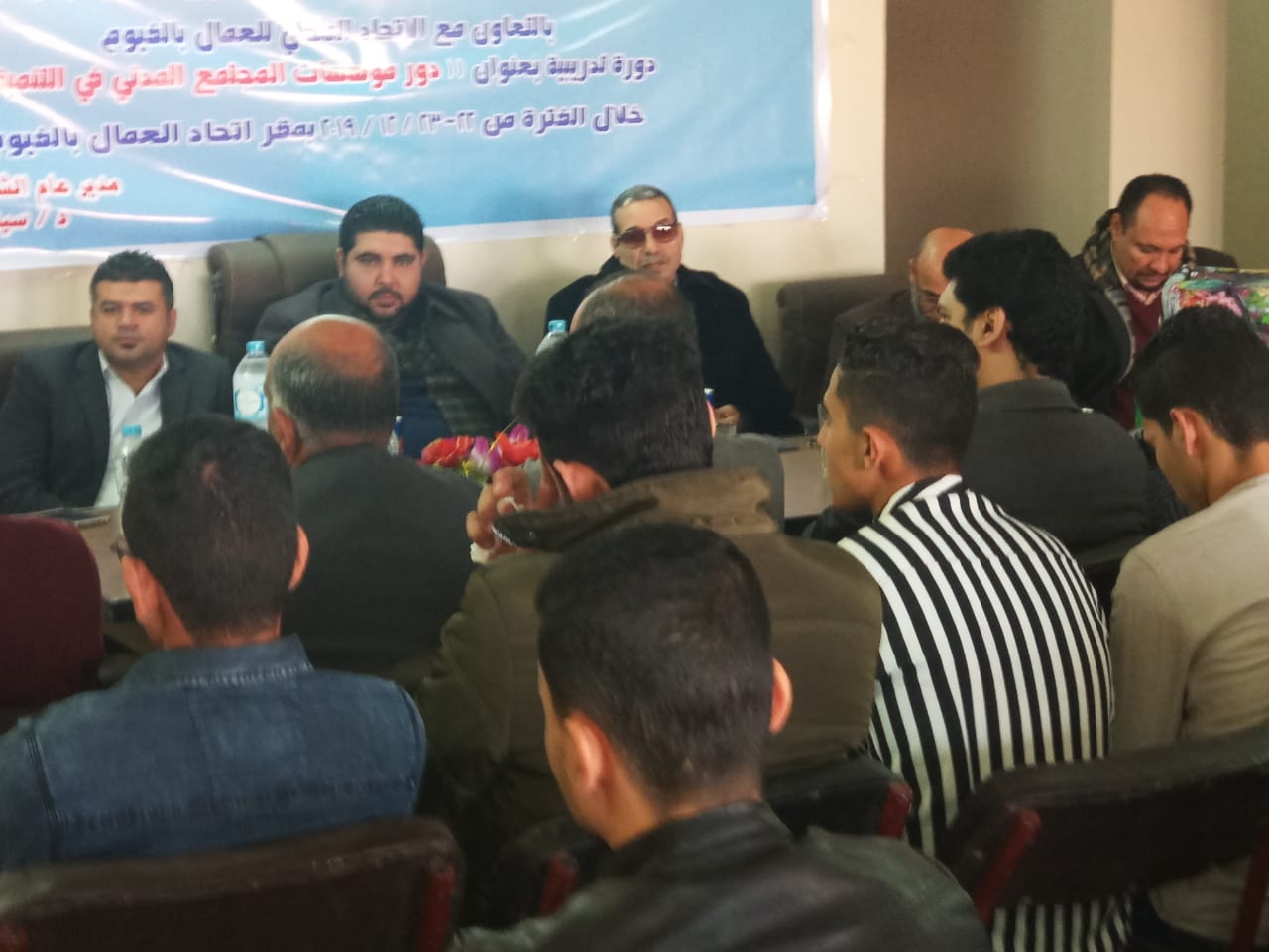 شاركت سكرتارية الشباب باتحاد عمال مصر في الدورة التدريبية التي نظمتها سكرتارية شباب الاتحاد المحلى بالفيوم برئاسة محمد جابر حول دور مؤسسات المجتمع المدنى في التنمية بحضور أحمد عبدالعزيز رئيس اتحاد محلى الفيوم ومحمد ربيع عضو نقابة الصحافة والطباعة وأحمد الغنام عضو نقابة الانتاج الحربى واسماعيل محمد اسماعيل رئيس ادارة البرلمان والتعليم المدنى بمديرية الشباب والرياضة.