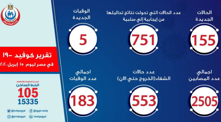 وتواصل وزارة الصحة والسكان رفع استعداداتها بجميع المحافظات، ومتابعة الموقف أولاً بأول بشأن فيروس “كورونا المستجد”، واتخاذ كافة الإجراءات الوقائية اللازمة ضد أي فيروسات أو أمراض معدية، كما تم تخصيص الخط الساخن “105”، و”15335″ لتلقي استفسارات المواطنين بشأن فيروس كورونا المستجد والأمراض المعدية.