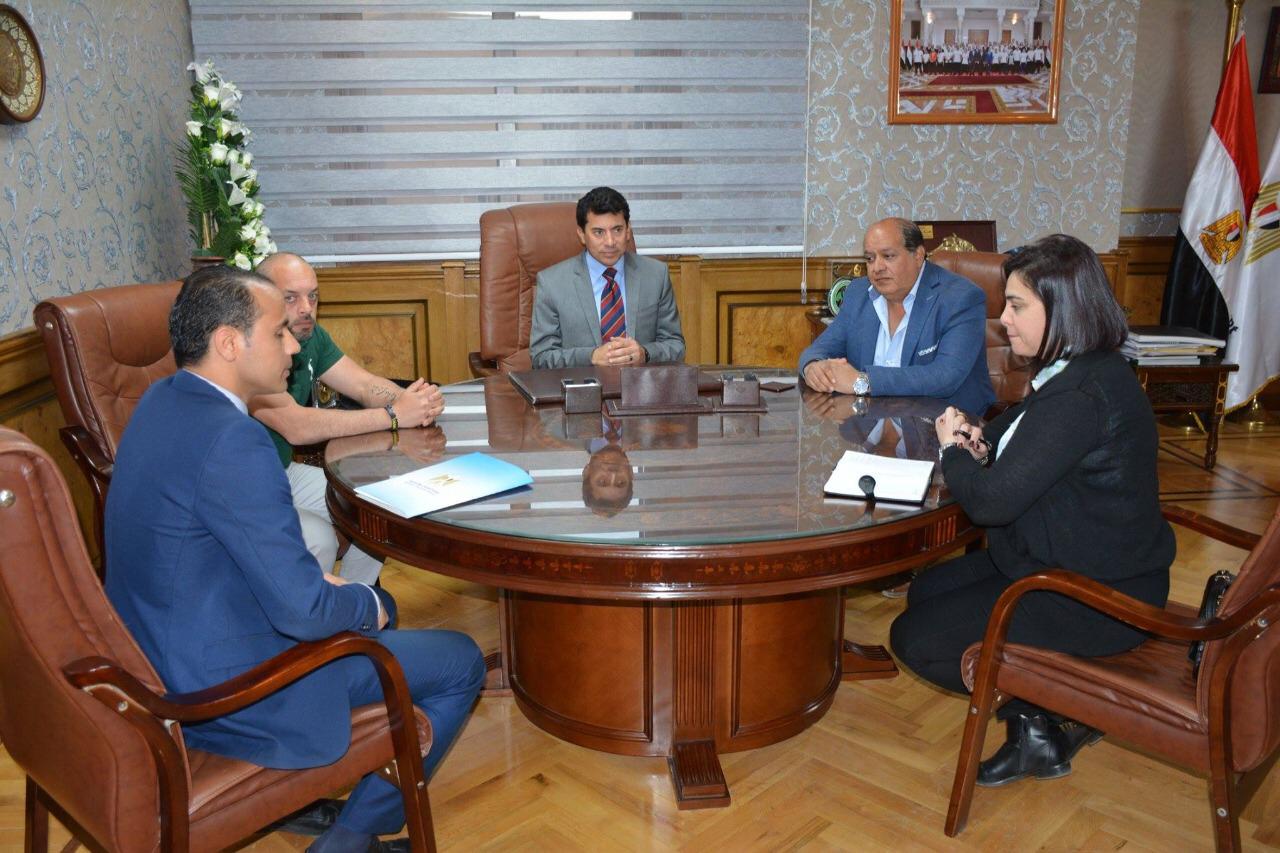 حضر اللقاء عمر العربي المدير التنفيذي للمشروع وسماح عمار المستشار الإعلامي للمشروع وأحمد جمعة معاون الوزير للتنمية الرياضية.