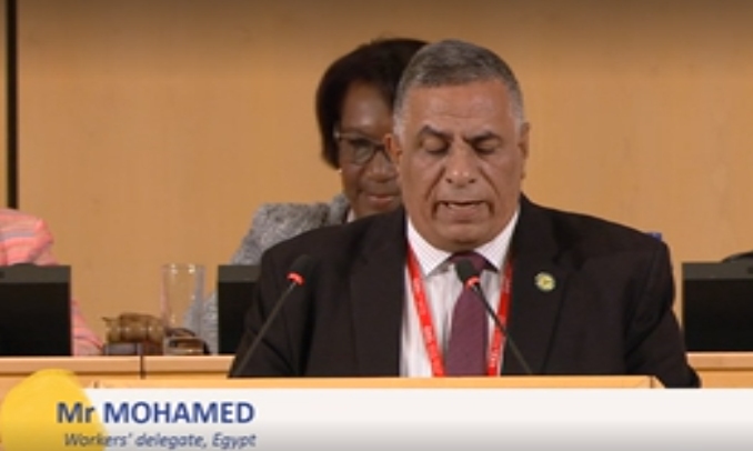بالأصالة عن نفسي وعن النقابات العمالية المصرية والاتحاد العام لنقابات عمال مصر يسرني أن أتقدم إليكم وأعضاء المؤتمر ممثلي أطراف العمل الثلاثة في 187 دولة بخالص تحية وتقدير عمال مصر متمنيا لكم التوفيق والنجاح خلال أعمال الدورة 108 لمؤتمر العمل الدولي عن عام 2019.