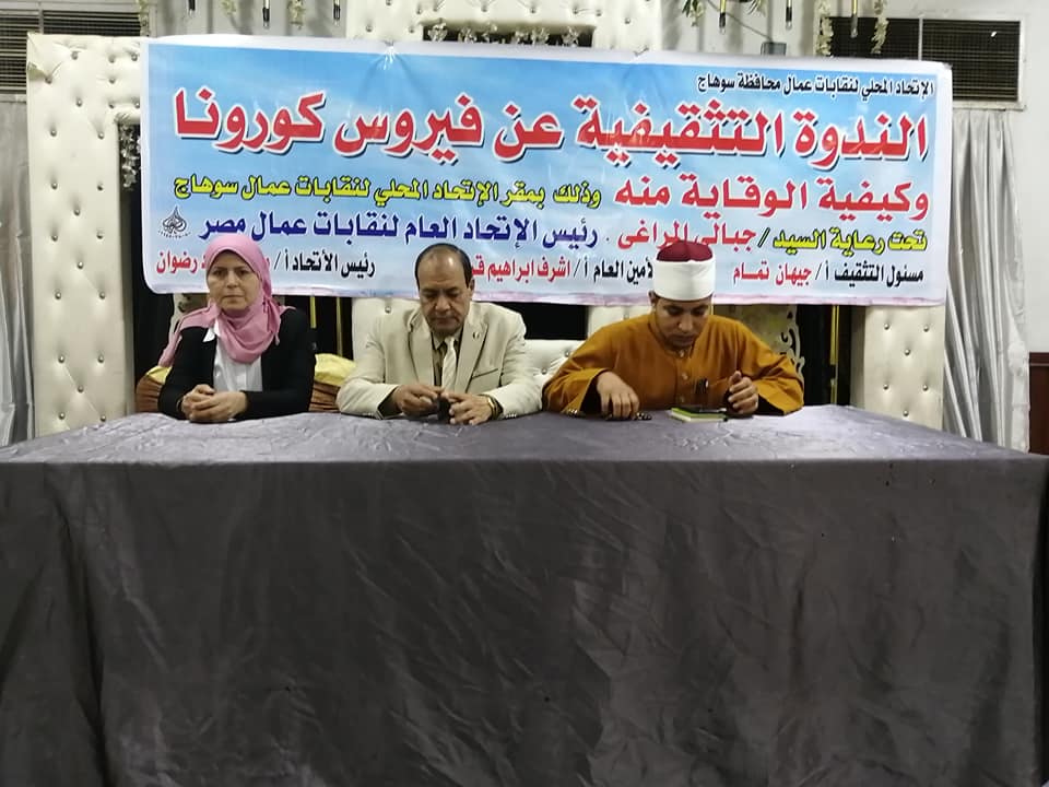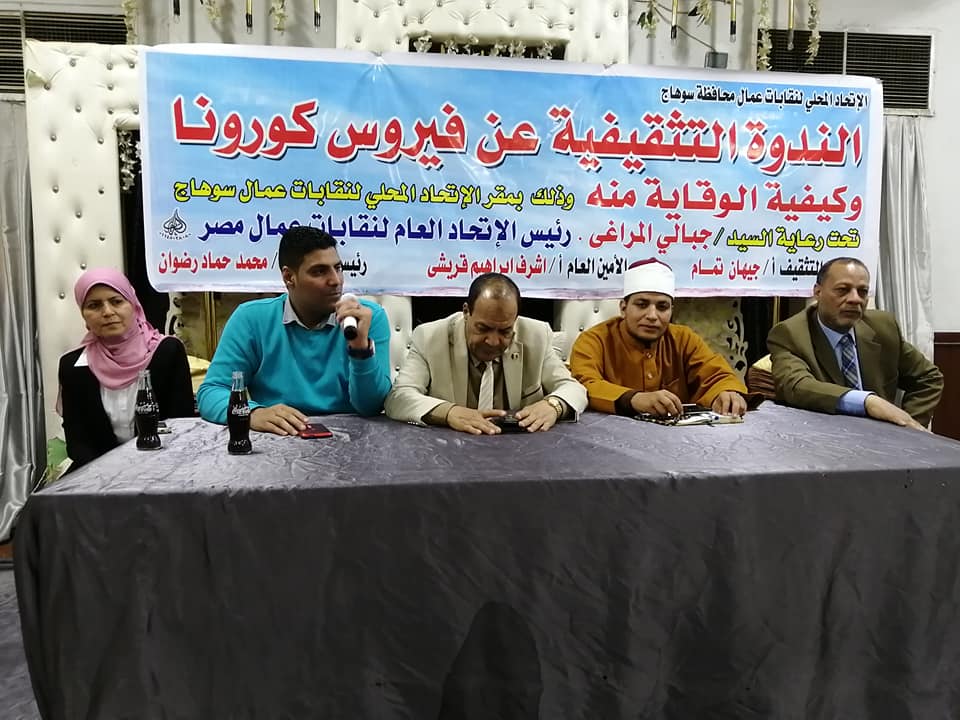 نظمت سكرتارية التثقيف والتدريب، برئاسة جيهان تمام، بالاتحاد المحلى لعمال سوهاج ندوة تثقيفية عن فيروس كورونا تحت رعاية النائب جبالي المراغي رئيس الاتحاد العام لنقابات عمال مصر، وبحضور محمد حماد رضوان رئيس الاتحاد المحلي لنقابات عمال سوهاج، واشرف قريشي الامين العام.