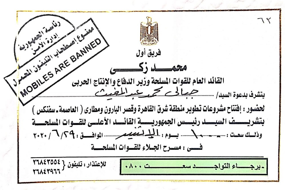 تلقى النائب جبالى المراغى رئيس الاتحاد العام لنقابات عمال مصر ورئيس لجنة القوى العاملة بمجلس النواب دعوة لحضور افتتاح مشروعات تطوير منطقة شرق القاهرة وقصر البارون ومطارى (العاصمة، سفنكس) صباح أمس بتشريف السيد الرئيس عبد الفتاح السيسى رئيس الجمهورية والقائد الأعلى للقوات المسلحة والذى أقيم بمسرح الجلاء للقوات المسلحة.
