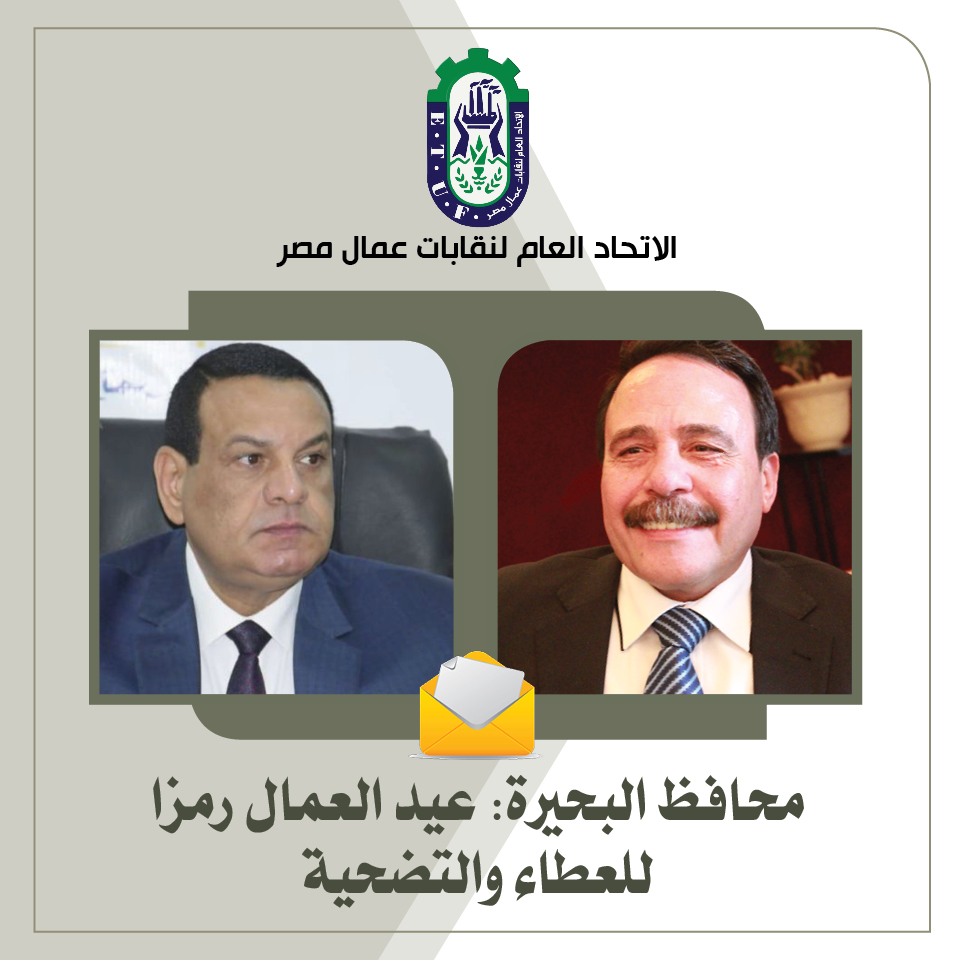 تلقى جبالى المراغى رئيس الاتحاد العام لنقابات عمال مصر برقية تهنئة من اللواء هشام عبد الغنى آمنة محافظ البحيرة بمناسبة عيد العمال متمنيا لهم دوام الصحة والسعادة وأن ينعم على شعب مصر العظيم بالأمن والأمان والاستقرار بسواعد أبنائه عمال مصر الشرفاء الذين أسهموا بجهودهم وفكرهم فى إعلاء مصرنا الغالية حتى صار عيد العمال رمزا للعطاء والتضحية فى ظل القيادة الحكيمة للسيد الرئيس عبد الفتاح السيسي رئيس الجمهورية.