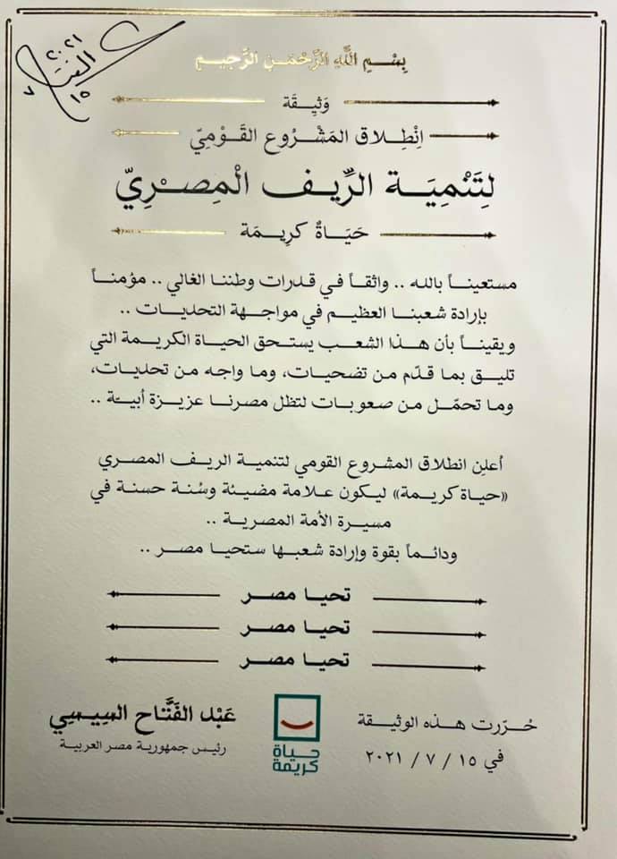 أشاد رئيس الاتحاد العام لنقابات عمال مصر بمبادرة “حياة كريمة” التي أطلقها الرئيس عبد الفتاح السيسي، والتي تهدف إلى تحديث كافة جوانب الحياة بالقري في جميع المحافظات، والتي تضم ٥٨٪ من إجمالي سكان مصر، وهو ما يمثل استثمارا في تنمية وبناء الإنسان المصري بالمفهوم الشامل، وتحقيق أهداف التنمية المستدامة للأمم المتحدة وتنفيذ متحضر لمبادئ حقوق الإنسان واستثمار كبير في الموارد البشرية باعتبارها قاطرة التقدم إلى المستقبل الذي يليق بمصر.