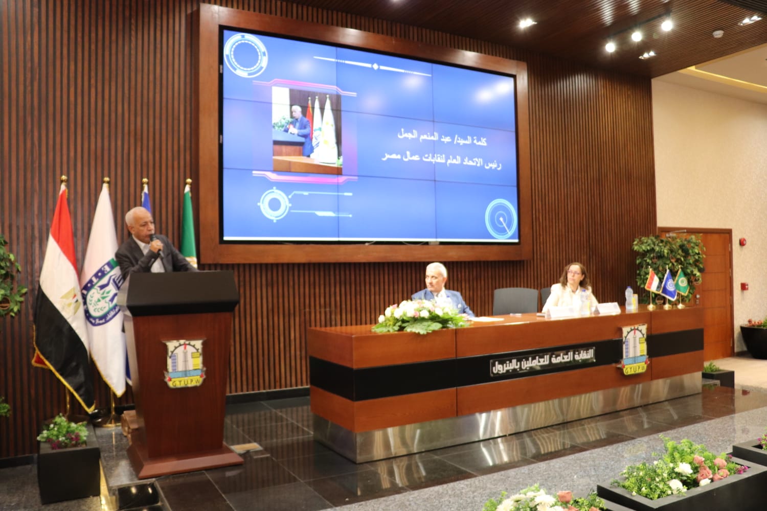 ورحب المحاسب أحمد السروجي رئيس النقابة العامة للعاملين بالبترول بالسادة الحضور وعلي رأسهم السيد عبدالمنعم الجمل رئيس الإتحاد لنقابات عمال مصر والسيدة منجيه هادفي المشرفة علي إدارة التنمية البشرية والتشغيل بالمنظمة.