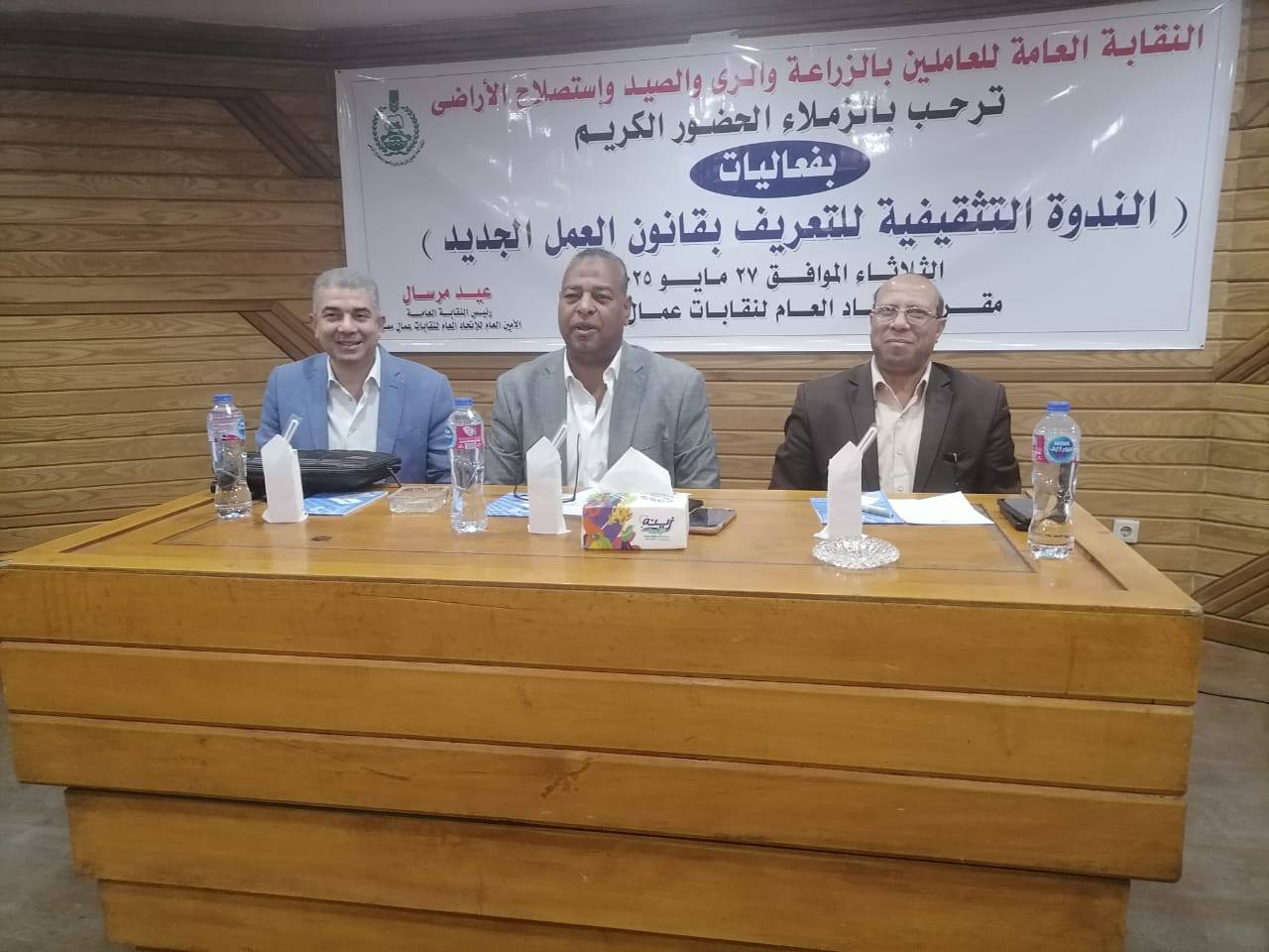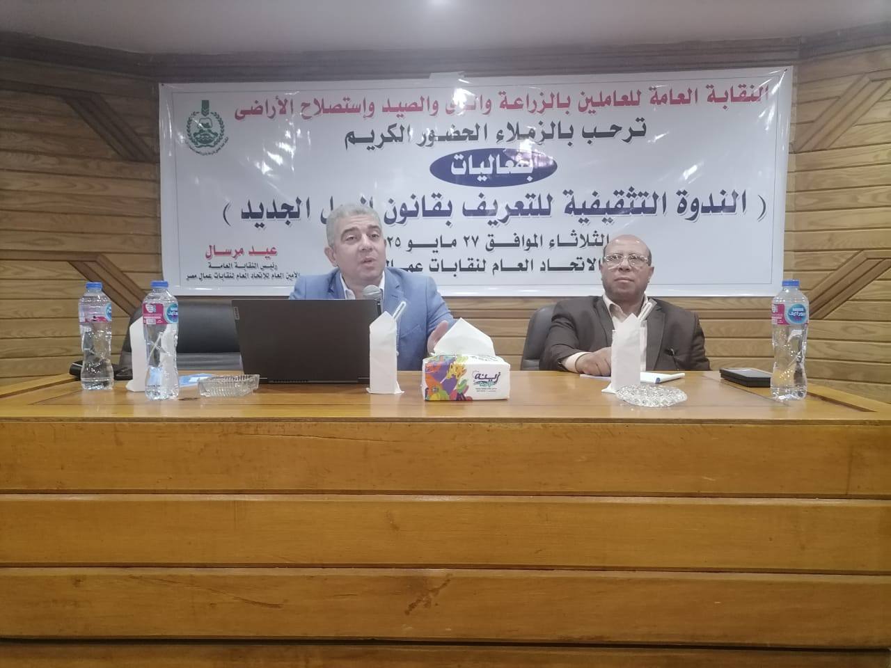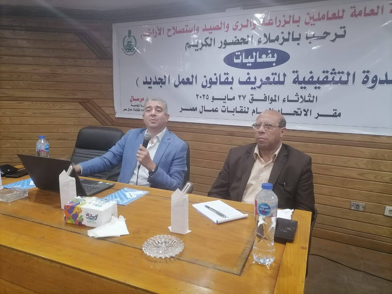 As part of the ongoing series of educational courses organized by the General Syndicate of Workers in Agriculture, Irrigation, Fishing, and Land Reclamation, headed by Engineer Eid Marsal, a large seminar was held to explain the new Labor Law No. 14 of 2025. The event was attended by 60 union members from various committees, along with several labor leaders. This seminar comes as part of the syndicate’s efforts to enhance workers’ legal awareness and clarify the significant amendments introduced by the new law to support investment and encourage the private sector by balancing the rights and duties of both parties in the workplace.