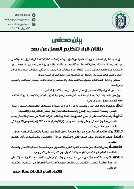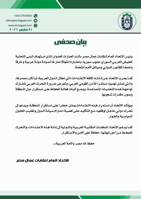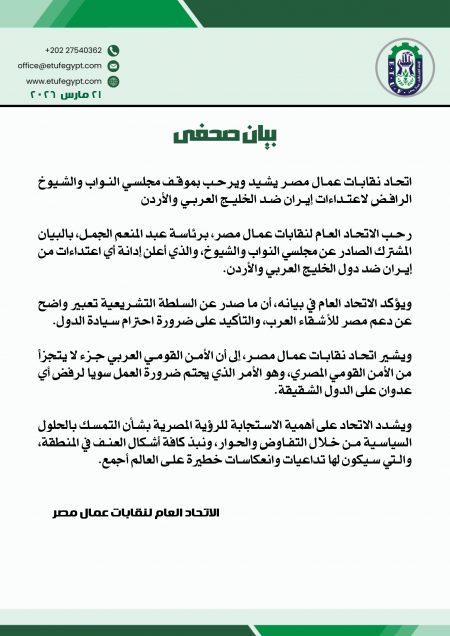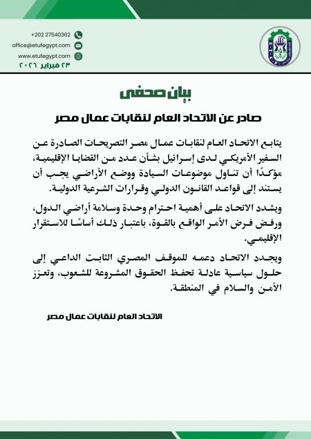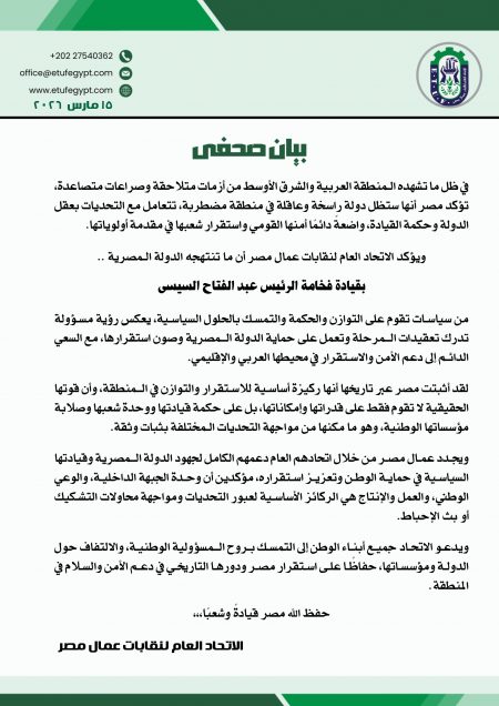 Sous l’auspice de Son Excellence le Président Abdelfattah El-Sissi, le Syndicat des Travailleurs Egyptiens achève les préparations pour accueillir le 43ème session de l’Organisation de l’Unité Syndicale Africaine OUSA