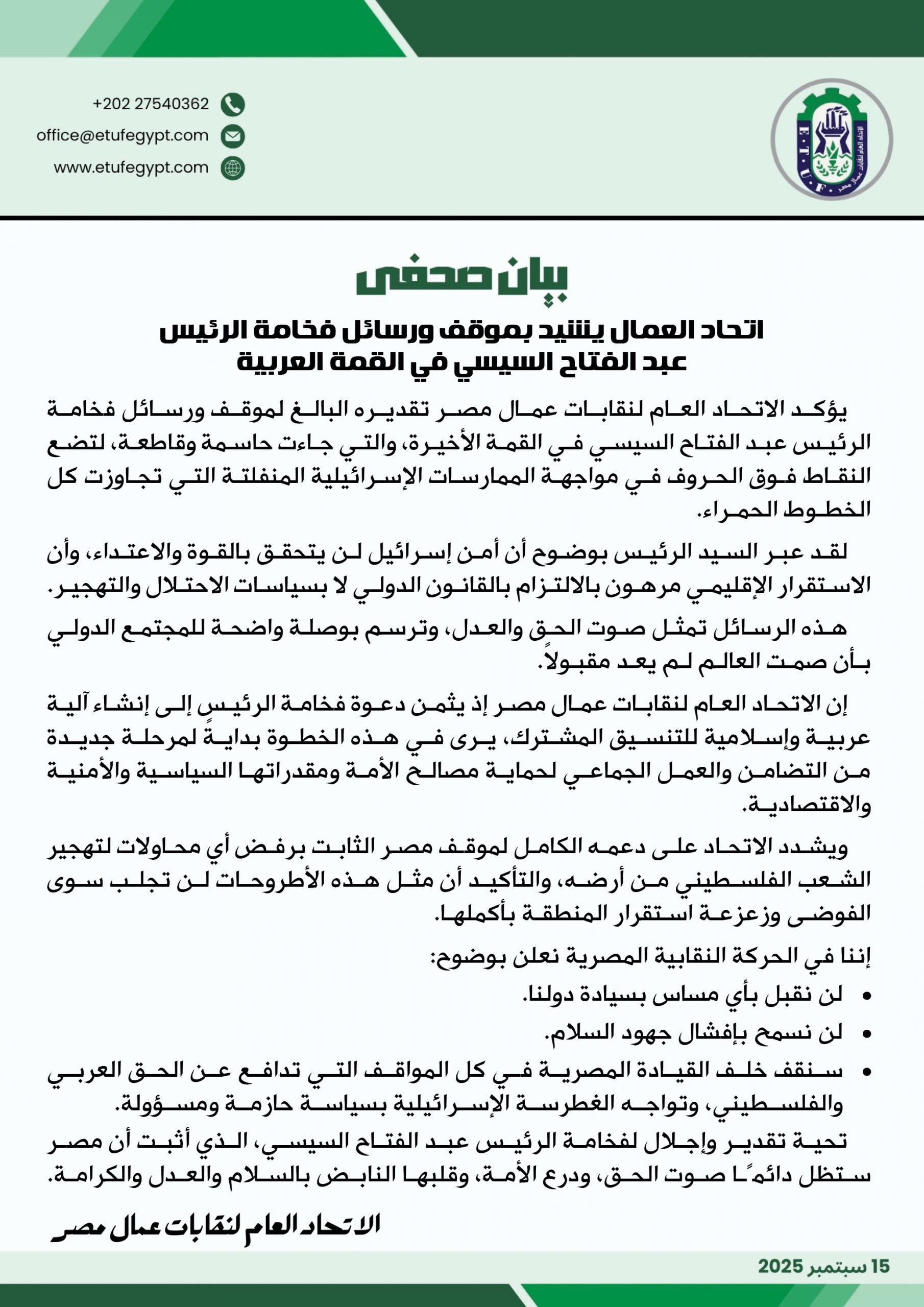 إن الاتحاد العام لنقابات عمال مصر إذ يثمن دعوة فخامة الرئيس إلى إنشاء آلية عربية وإسلامية للتنسيق المشترك، يرى في هذه الخطوة بدايةً لمرحلة جديدة من التضامن والعمل الجماعي لحماية مصالح الأمة ومقدراتها السياسية والأمنية والاقتصادية.