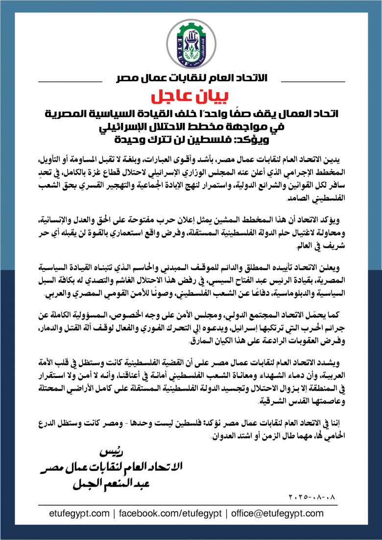 ويشدد الاتحاد العام لنقابات عمال مصر على أن القضية الفلسطينية كانت وستظل في قلب الأمة العربية، وأن دماء الشهداء ومعاناة الشعب الفلسطيني أمانة في أعناقنا، وأنه لا أمن ولا استقرار في المنطقة إلا بزوال الاحتلال وتجسيد الدولة الفلسطينية المستقلة على كامل الأراضي المحتلة وعاصمتها القدس الشرقية.