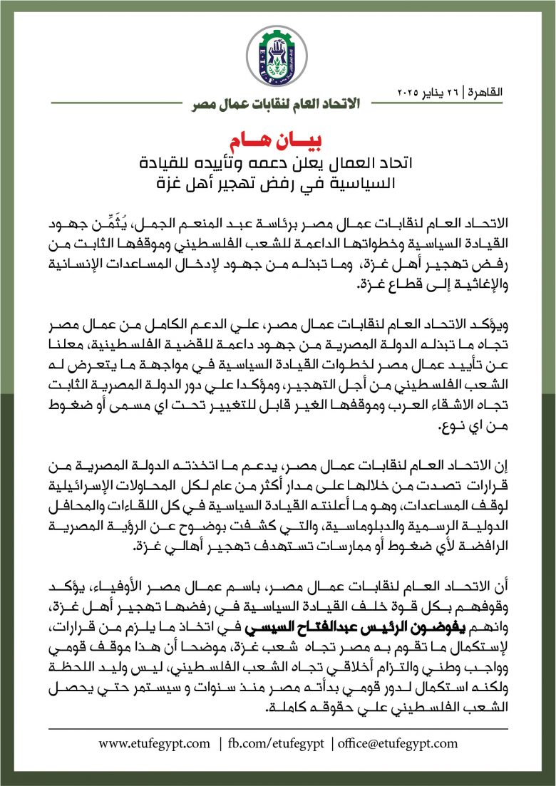 Sous l’auspice de Son Excellence le Président Abdelfattah El-Sissi, le Syndicat des Travailleurs Egyptiens achève les préparations pour accueillir le 43ème session de l’Organisation de l’Unité Syndicale Africaine OUSA