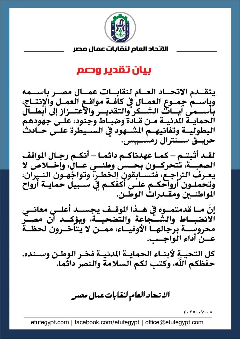 يتقدم الاتحاد العام لنقابات عمال مصر باسمه وباسم جموع العمال في كافة مواقع العمل والإنتاج بأسمى آيات الشكر والتقدير والاعتزاز إلى أبطال الحماية المدنية من قادة وضباط وجنود على جهودهم البطولية وتفانيهم المشهود في السيطرة على حادث حريق سنترال رمسيس.