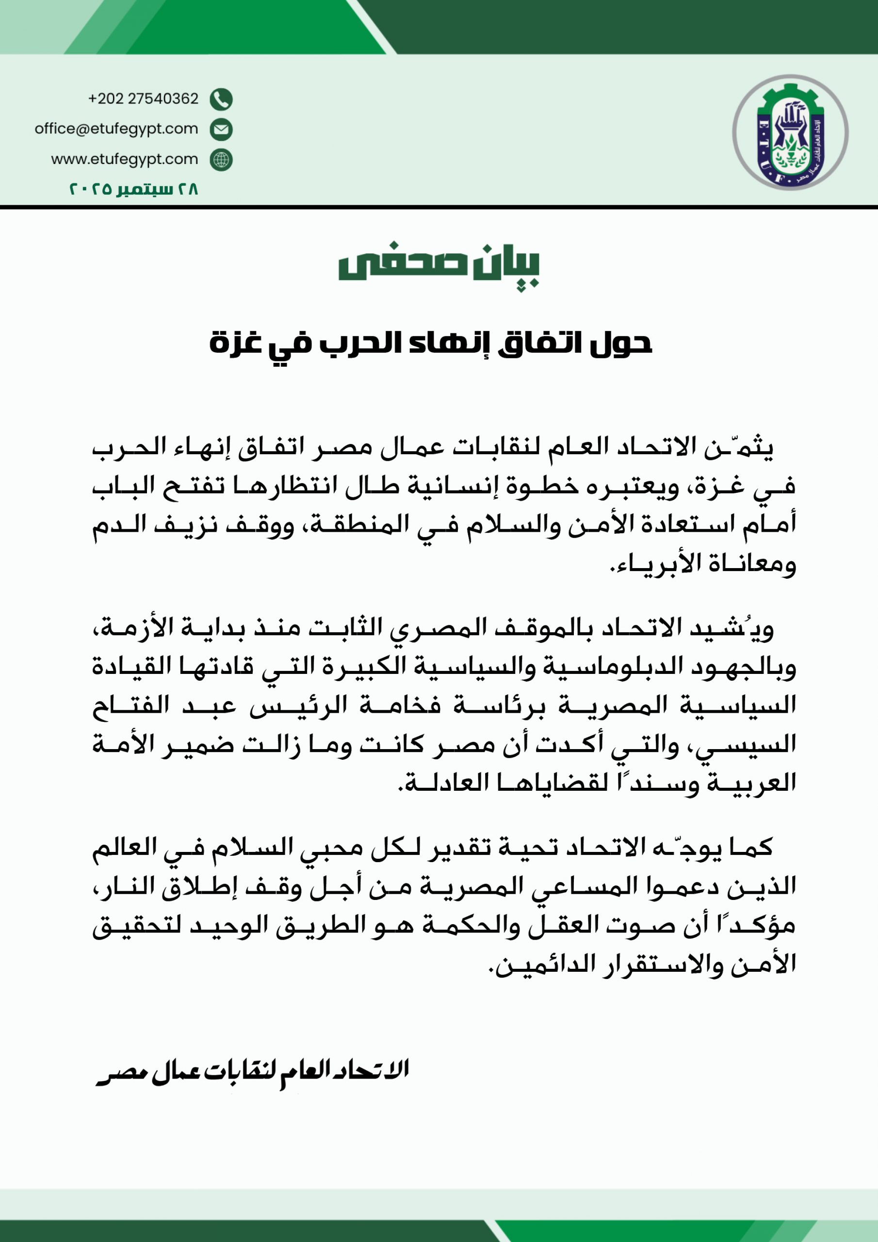 يثمّن الاتحاد العام لنقابات عمال مصر اتفاق إنهاء الحـ ـرب في غـ&ـزة، ويعتبره خطوة إنسانية طال انتظارها تفتح الباب أمام استعادة الأمن والسلام في المنطقة، ووقف نزيف الدم ومعاناة الأبرياء.
