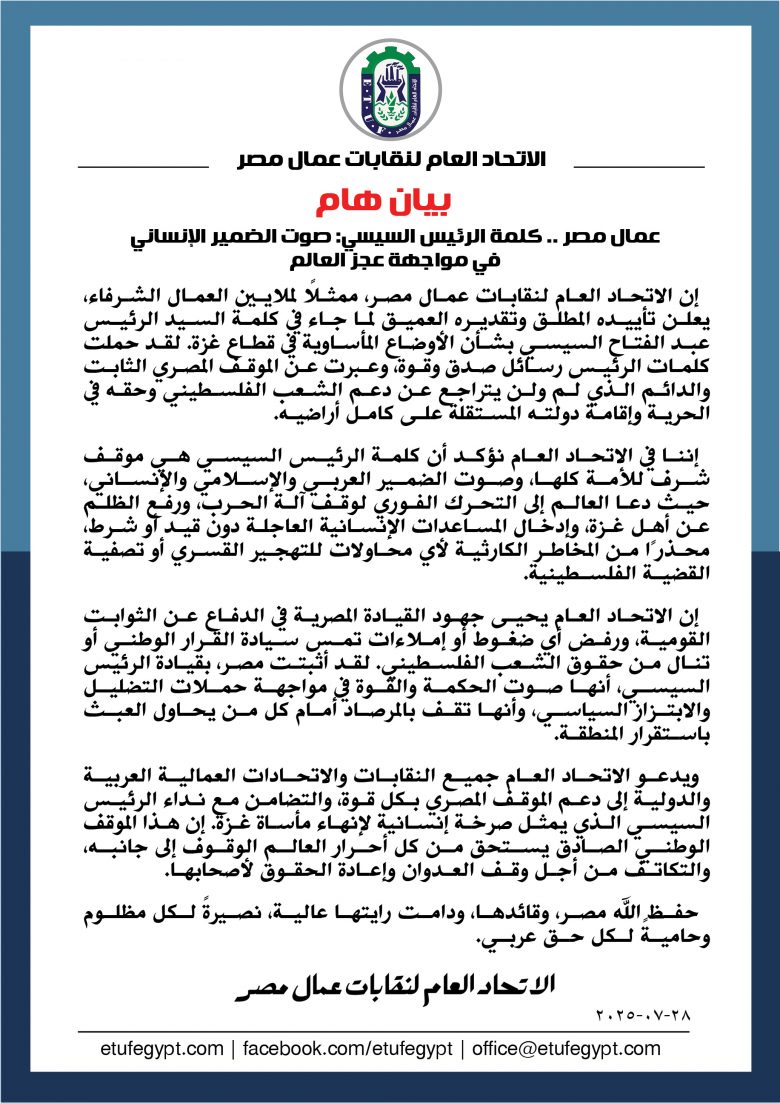 إن الاتحاد العام لنقابات عمال مصر، ممثلاً لملايين العمال الشرفاء يعلن تأييده المطلق وتقديره العميق لما جاء في كلمة السيد الرئيس عبد الفتاح السيسي بشأن الأوضاع المأساوية في قطاع غزة. لقد حملت كلمات الرئيس رسائل صدق وقوة، وعبرت عن الموقف المصري الثابت والدائم الذي لم ولن يتراجع عن دعم الشعب الفلسطيني وحقه في الحرية وإقامة دولته المستقلة على كامل أراضيه.