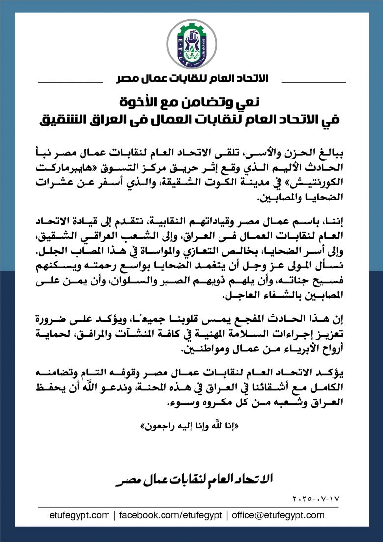 إننا، باسم عمال مصر وقياداتهم النقابية، نتقدم إلى قيادة الاتحاد العام لنقابات العمال في العراق، وإلى الشعب العراقي الشقيق وإلى أسر الضحايا، بخالص التعازي والمواساة في هذا المصاب الجلل. نسأل المولى عز وجل أن يتغمد الضحايا بواسع رحمته ويسكنهم فسيح جناته، وأن يلهم ذويهم الصبر والسلوان، وأن يمن على المصابين بالشفاء العاجل.