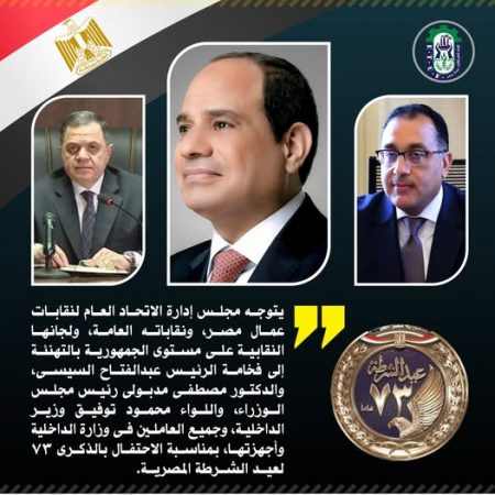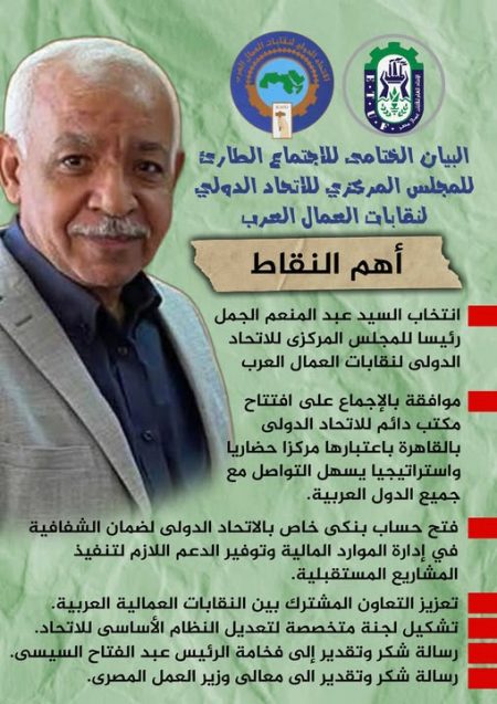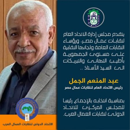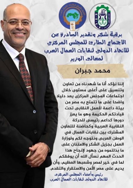 تهنئة رئيس اتحاد العمال لانتخابه رئيسا للمجلس المركزي للاتحاد الدولى لنقابات العمال العرب