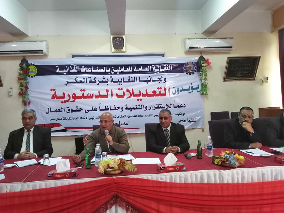 اعلن خالد عيش رئيس النقابة العامة للعاملين بالصناعات الغذائية تاييد النقابة العامة ولجانها النقابية للتعديلات الدستورية دعما للاستقرار والتنمية وحفاظا على حقوق العمال. جاء ذلك خلال المؤتمر الحاشد الذى عقد تحت رعاية وحضور خالد عبد اللطيف عيش، رئيس النقابه العامة ...